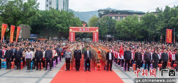 中新网(wang)广西新闻3月17日电 (宁彩霞 何应武)近日,田林(lin)县(xian)2026年春季新兵入伍欢送(song)大(da)会(hui)暨全民国防教育宣传活动在该县(xian)群众文化大(da)舞台举行。身着戎装、胸(xiong)佩红花的新兵精神(shen)抖擞,带着家乡(xiang)人民的殷切嘱托整装待发(fa),即将奔赴全国各地军营履(lu)行保家卫国的神(shen)圣使命。社会(hui)各界代表到场为新兵壮行,现场满溢(yi)“参军光荣、拥军爱军”的浓厚氛(fen)围。