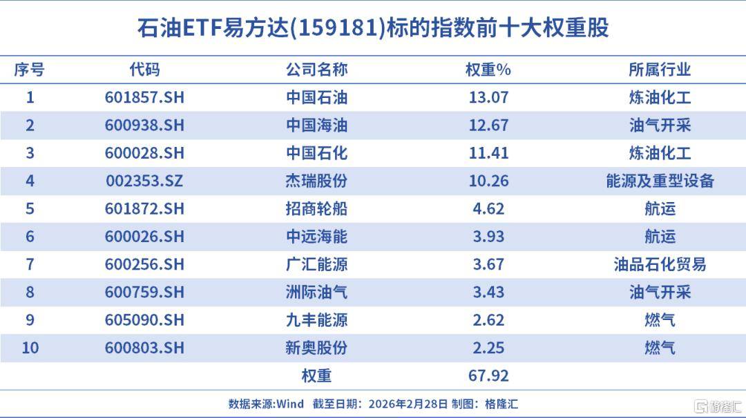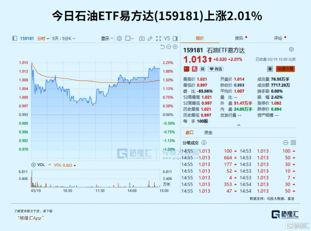 但股市的油气产(chan)业(ye)链(lian)板块逆势集体飙涨,大批避险资金(jin)加速涌(yong)入,油气勘探开采板块大涨4.69%,带动燃气、煤炭、页岩气等细分(fen)板块明显跟涨。中国海油、中国石油涨超(chao)5%,带动本日(ri)上(shang)市的石油ETF易方达(159181)上(shang)涨2.01%。