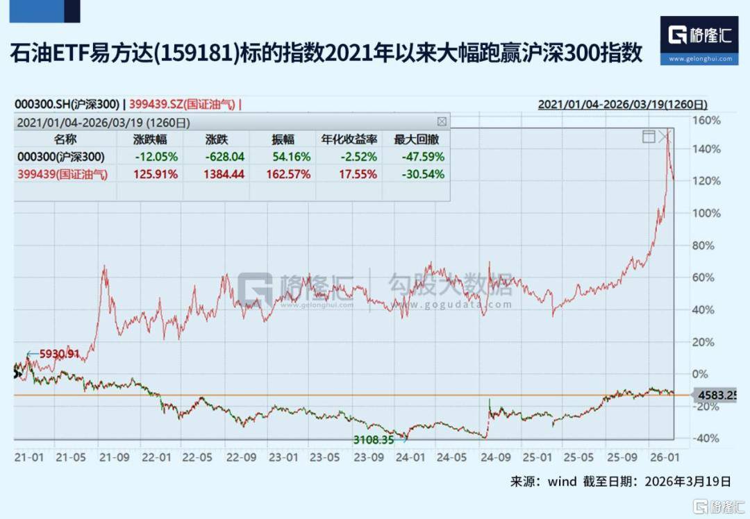 国证油气指数2021–2025年五个完整年度收(shou)益率离别为33.93%、0.05%、7.01%、10.90%、10.13%。截至(zhi)2026年3月19日(ri),国证油气指数2021年以来涨幅125.91%,同期沪深300指数跌12.05%。