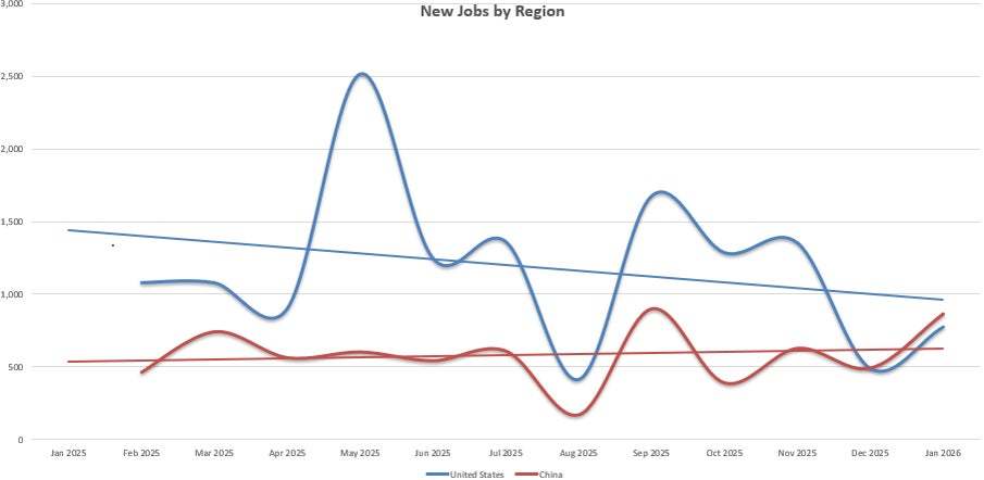 2025年12月(yue)和2026年1月(yue),中国的新增游戏(xi)岗位已经超过了(le)美国。图片来源:Sorcery