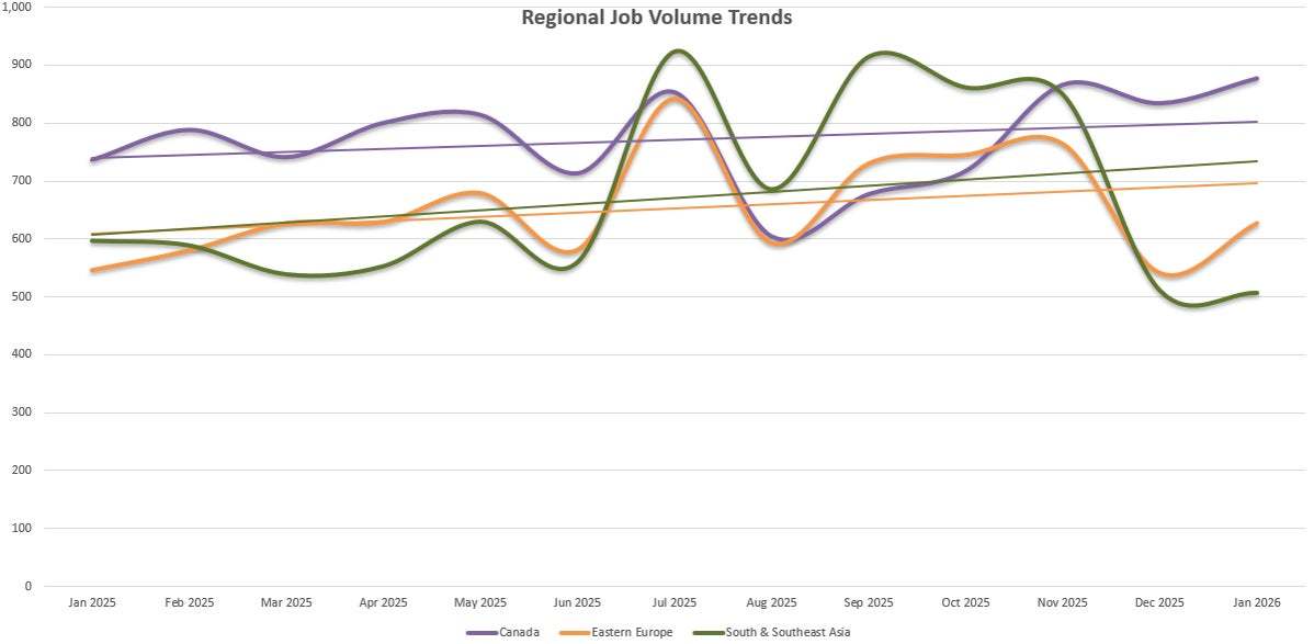 这种游戏(xi)职位向(xiang)东迁移的趋势不仅是中国,东欧和南亚、东南亚的职位增长也达到了(le)50%(尽(jin)管(guan)最近几个月(yue)增幅有所(suo)减缓)。出乎意料的是加拿大也逆势而上,职位数量同比(bi)增长了(le)20%。考虑到加拿大被(bei)低估的游戏(xi)开发(fa)实力,这或许也在意料之中。