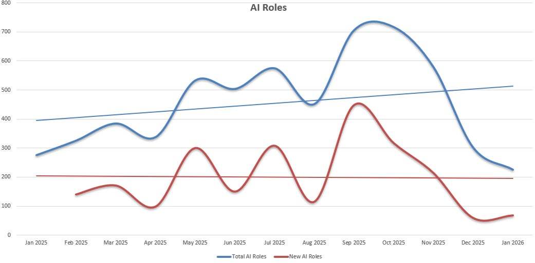 AI相关的岗位呈(cheng)现爆发(fa)式(shi)增长,9月(yue)的岗位数量为1月(yue)的三倍。但近几个月(yue),行业对人工智能的投入有所(suo)放缓,开放岗位的数量已回(hui)落至2025年年初水平。