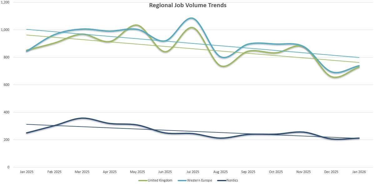 英国、西欧和北欧的职位数量有所(suo)下降。图片来源:Sorcery
