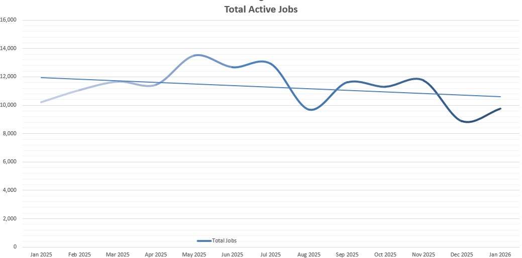 2025年,游戏(xi)行业的岗位数量整体呈(cheng)下滑,这并不让人意外。数据显示,全(quan)球岗位数量较2025年初减少4%。但是我们不能一概而论。事实上,2025年的大部分时间,岗位数量都高于这一水平,并且都比(bi)2025年1月(yue)要高。