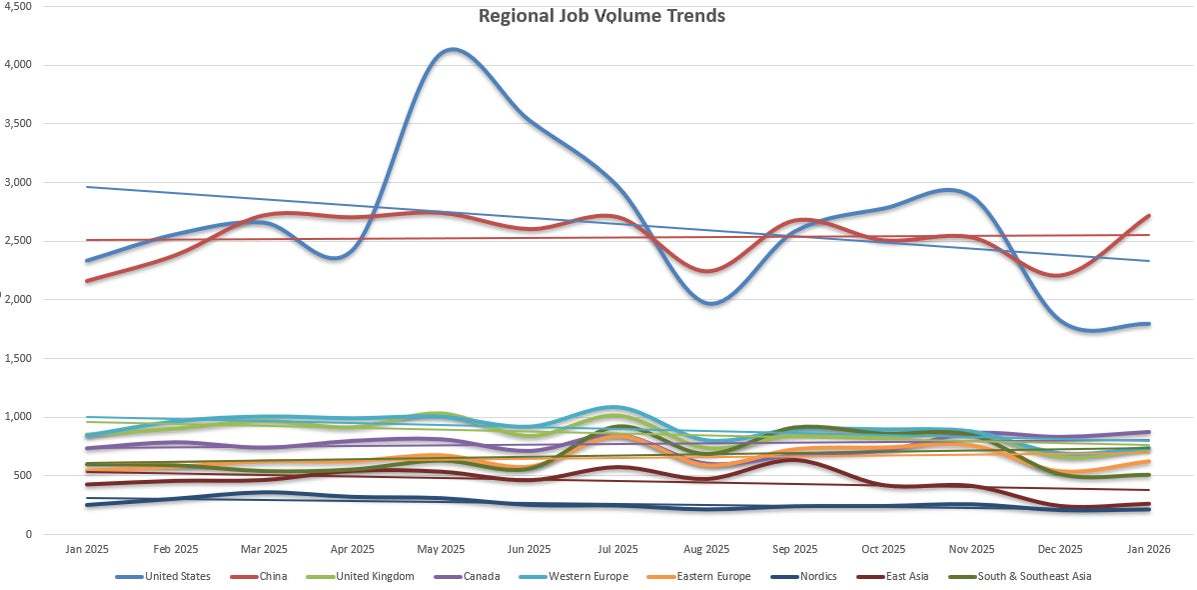 2025年,中国和美国一直在争夺游戏(xi)开发(fa)的头把交椅,大部分时间美国领先。但到了(le)2025年12月(yue)和2026年1月(yue),中国实现了(le)反超,其新增岗位数量增长了(le)25%。这是中国第一次连(lian)续两(liang)个月(yue)坐稳榜首,这或许预示着游戏(xi)就业市场的未来方向(xiang)。