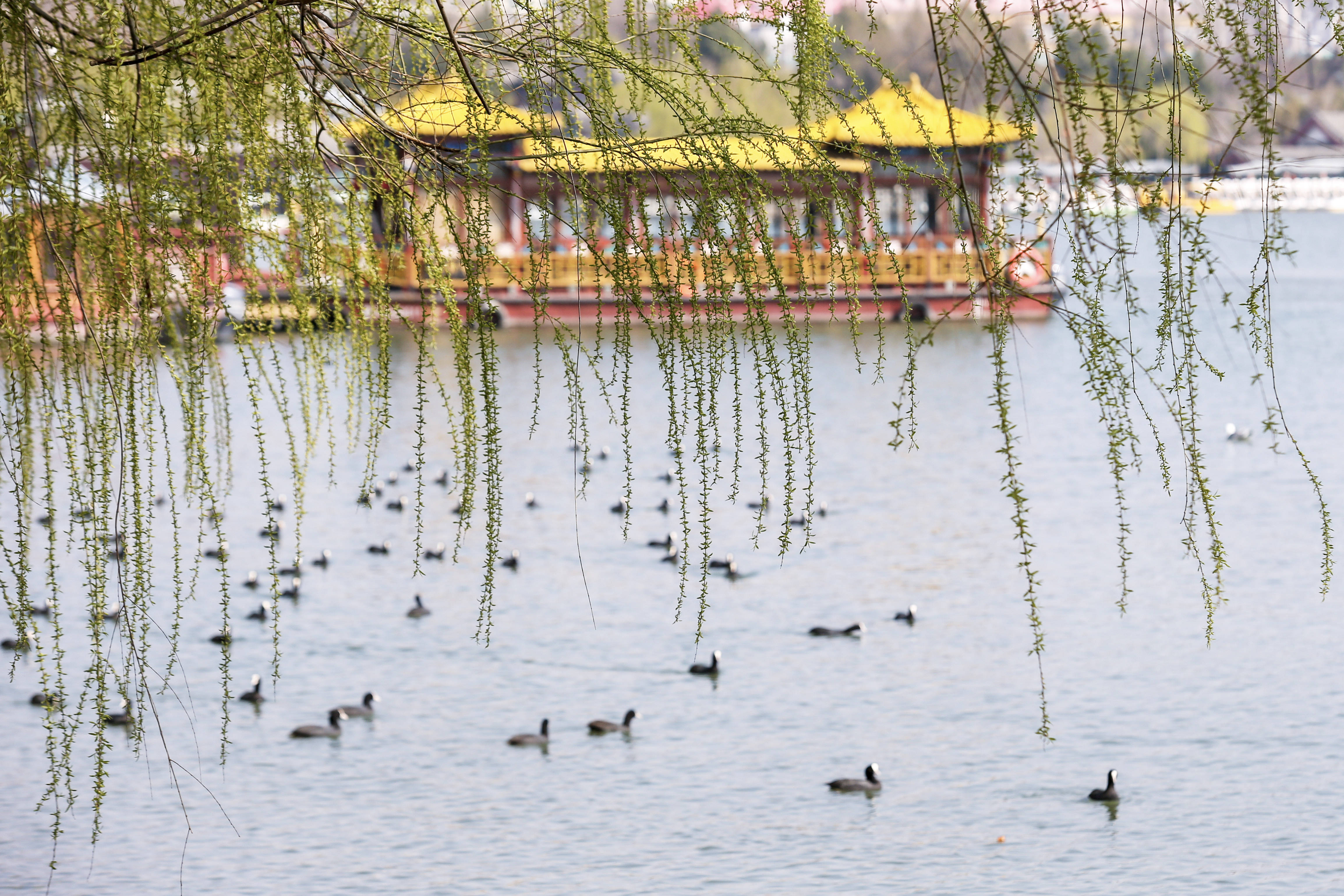 3月19日(ri),正在(zai)山东省济南市大明湖(hu),杨柳依依,一群白骨顶鸡畅游湖(hu)水之中。 新华社发(郝鑫城(cheng)摄)