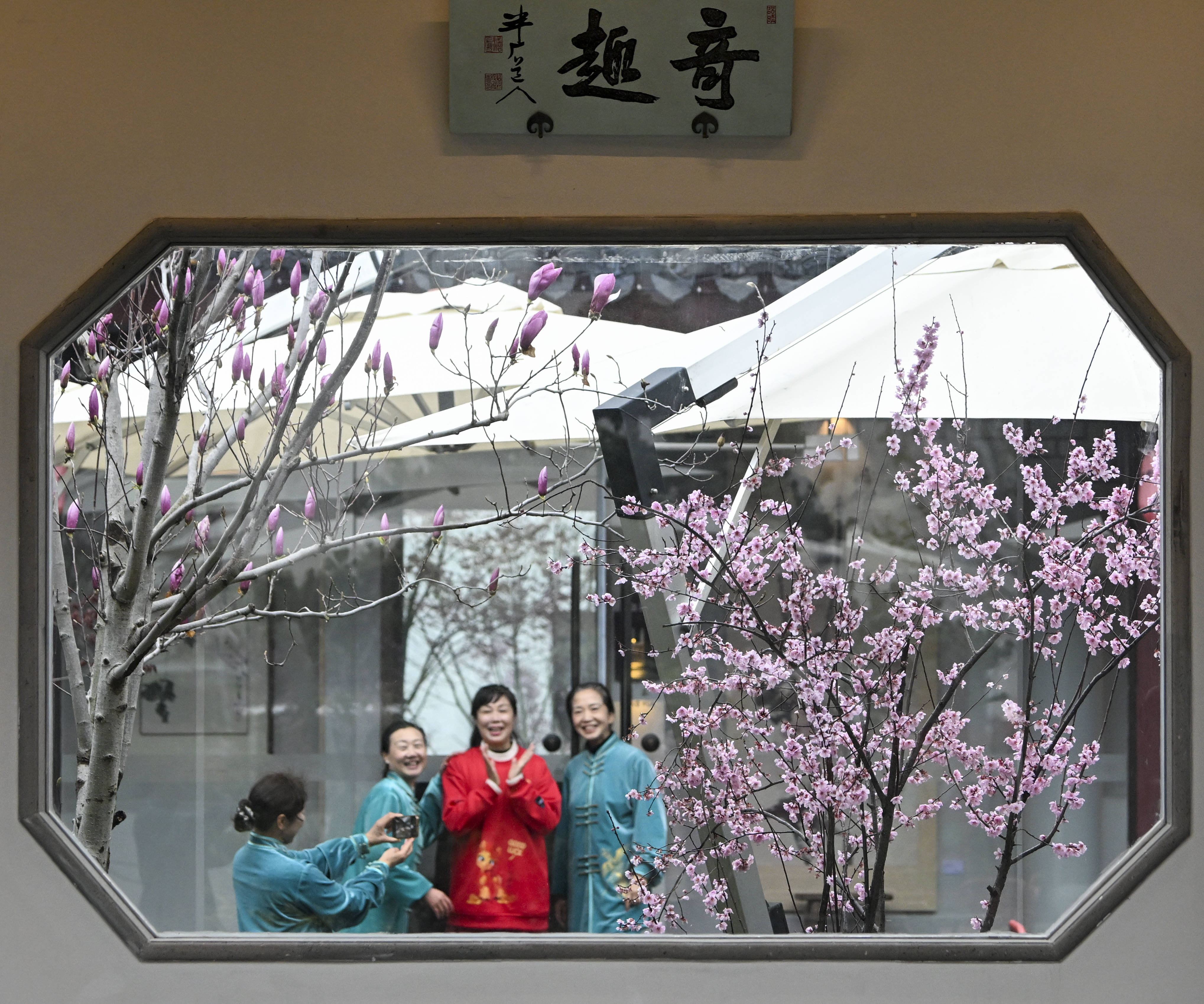 3月18日(ri),旅客正在(zai)江苏省扬州市何园景区(qu)赏花拍照(zhao)。 新华社发(孟德龙(long)摄)