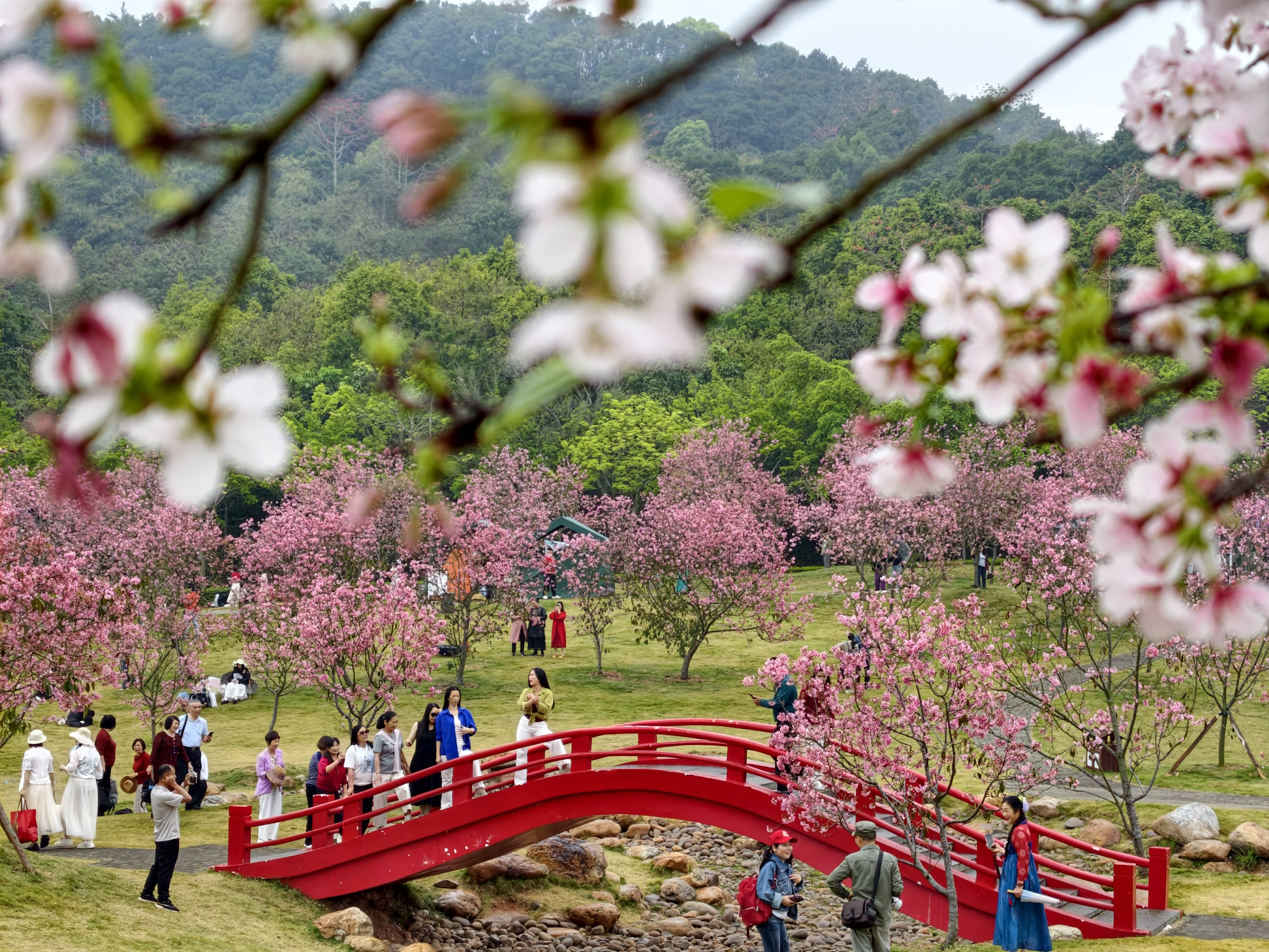 3月17日(ri),游人正在(zai)广东北宁市青秀山景物区(qu)樱花圃赏花游玩。 新华社发(喻湘泉摄)