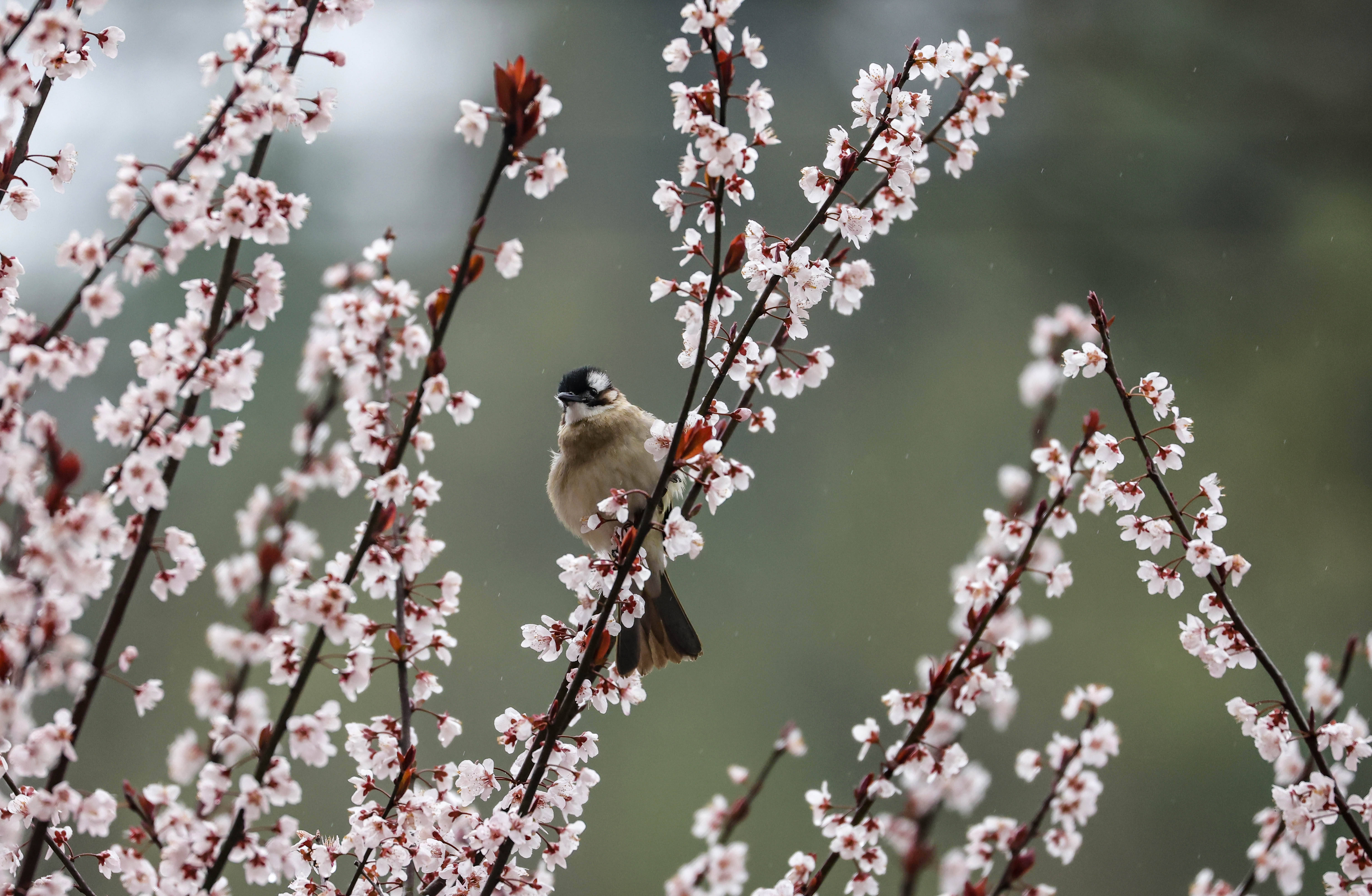 3月16日(ri),小鸟正在(zai)贵(gui)州省铜仁市玉屏侗族自治县皂角坪街道茅坪村的花间觅食。 新华社发(胡攀学摄)