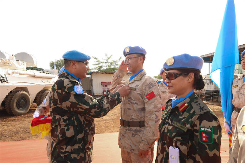 联阿平安部队特派团署理团长兼部队司令为官兵(bing)佩(pei)戴勋章。韩瑞田摄