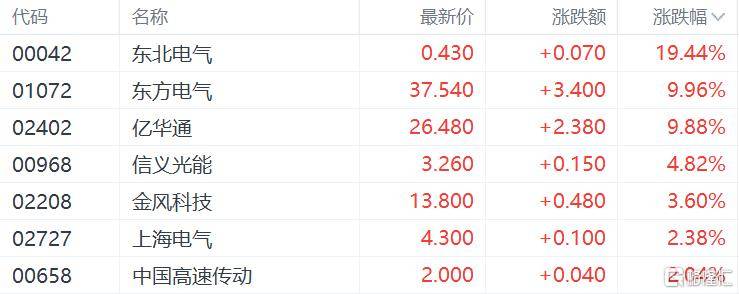 港股市场中,东北电气涨超19%,东方电气、亿华通涨超9%,金风科技、上海电气跟涨。