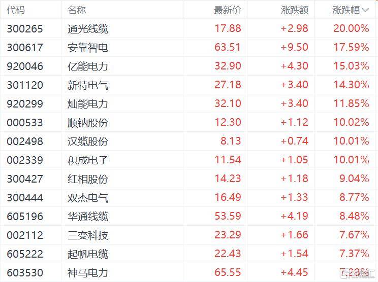 今日,电网设备概念逆(ni)势拉升,通光线缆20cm涨停,顺钠股份、汉缆股份、积成电子10cm涨停,安靠智电、亿能电力、灿能电力、新特电气涨超10%。