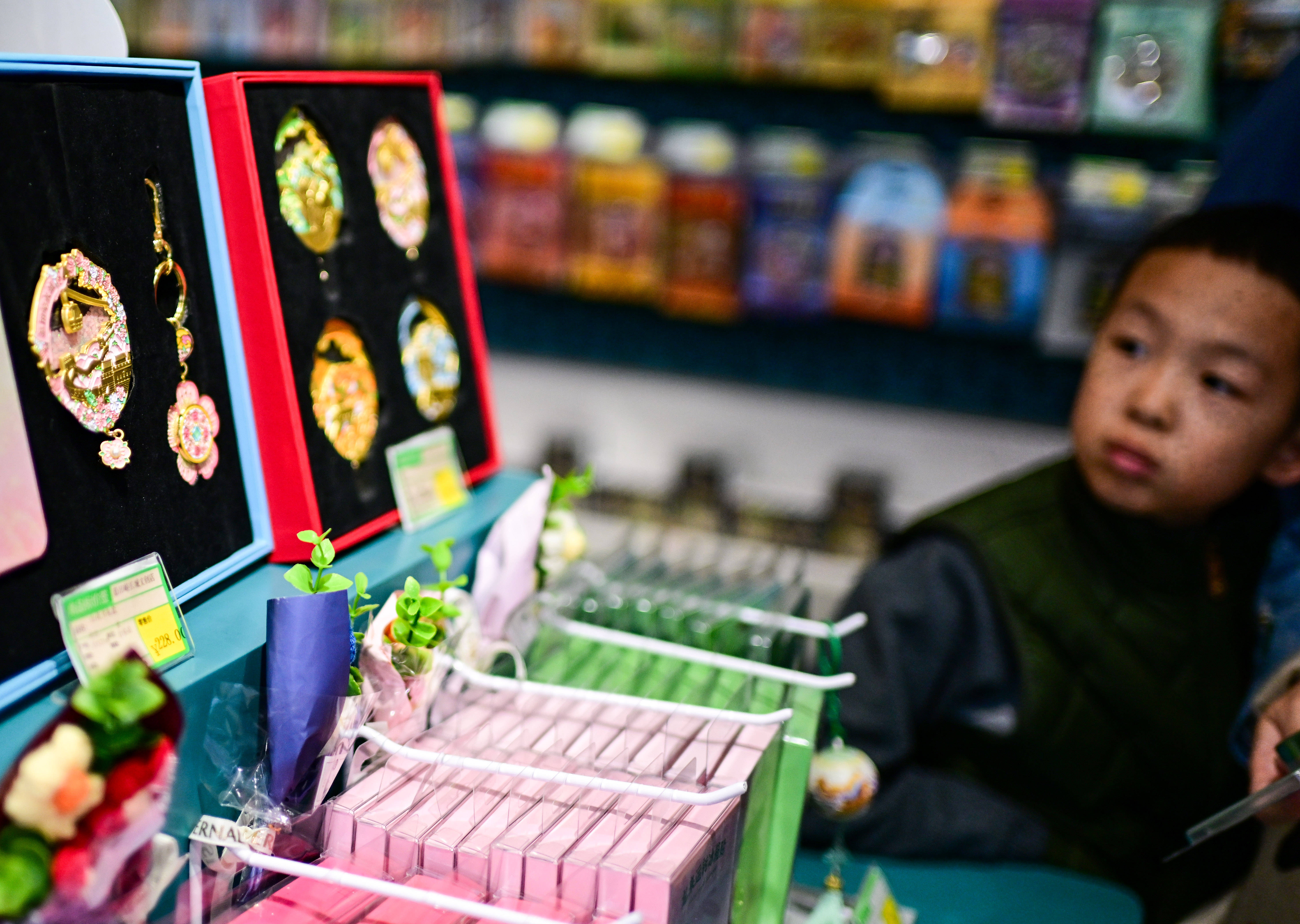 3月21日(ri),在北京慕田峪长城景区的一家文创店内,一位小朋友审察售(shou)卖的文创产(chan)物。 新华社记者(zhe) 陈晔华 摄
