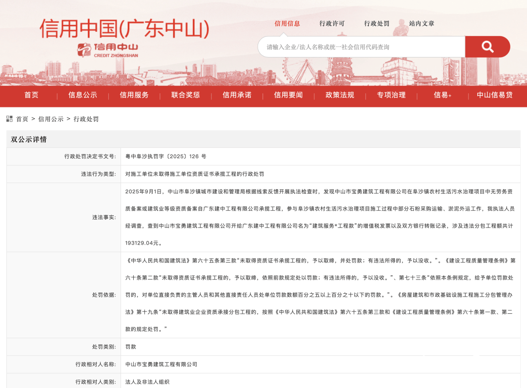 “粤中(zhong)阜沙执罚(fa)字〔2025〕126 号”显示(shi),2025年9月1日,中(zhong)山市阜沙镇城(cheng)市建设(she)和管理(li)局根(gen)据(ju)线索反馈开展执法检(jian)查时(shi),发明中(zhong)山市宝勇建筑工程无限公司在阜沙镇农村生活(huo)污水(shui)管理(li)项目中(zhong)无劳务资质备案或建筑业品级资质备案自广东建中(zhong)工程无限公司承揽(lan)工程,参与(yu)阜沙镇农村生活(huo)污水(shui)管理(li)项目施工过程中(zhong)部分石粉采购运输、淤泥外运事情。
