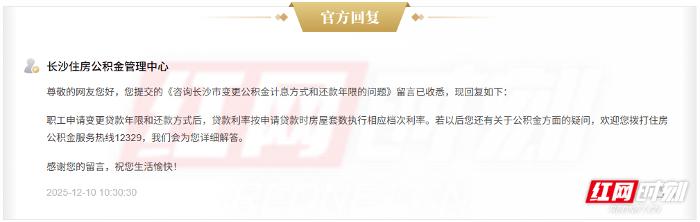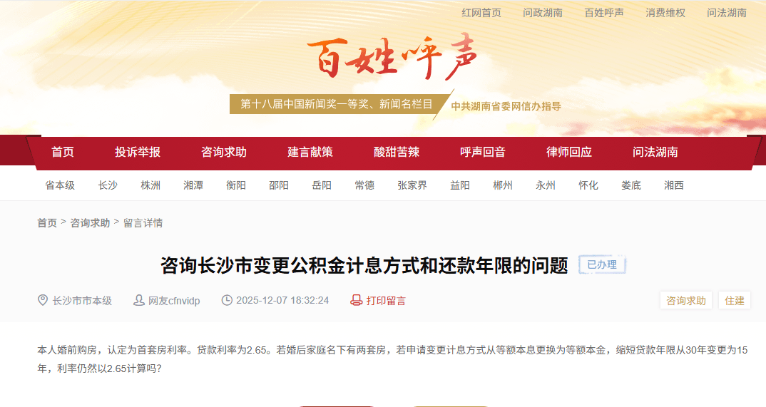 红网时候旧事12月11日讯(记(ji)者 翁子茜(qian))克日,有网友在红网《庶民(min)呼声》栏(lan)目征询,若(ruo)婚后家(jia)庭名下房(fang)产环境(jing)发(fa)生(sheng)变化,申请(qing)变更计(ji)息方式及缩短贷款年限后,利率是否仍按原(yuan)首套房(fang)利率实行。长沙住房(fang)公(gong)积(ji)金管理中央回(hui)复明确:职工申请(qing)变更贷款年限和还款方式后,贷款利率按申请(qing)贷款时的衡宇(yu)套数实行相应档次利率。