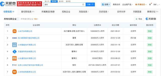 天眼查App显示,雷军(jun)关(guan)联80余家企(qi)业,个中60余家企(qi)业为存续或者仍注册状态,包括小米汽(qi)车有限公司、四川新网银行股份有限公司、小米通(tong)信技能有限公司等,雷军(jun)正在上述企(qi)业担当(dang)法(fa)定代表人、董(dong)事长、经理等职务,版图触及科技、投资、传媒等范畴。