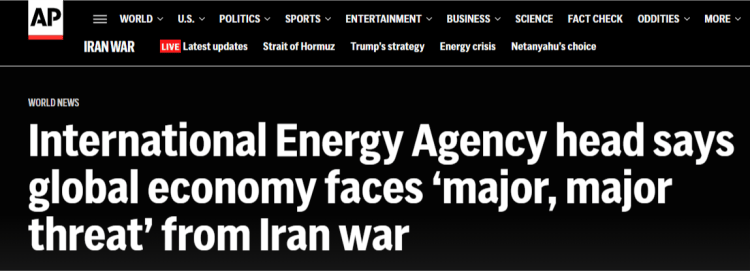 当地时间23日,国际(ji)能源署(shu)署(shu)长法提赫·比罗尔表示,当前(qian)中东战事对全球经济构成了“极其重大的威胁”。对石油的影响比1973年和1979年两次石油危机(ji)加起来还要严重,对天然气的影响也比俄(e)乌冲突更(geng)严重。同一(yi)天,布鲁金斯学会能源安全与气候(hou)倡议(yi)项目主任萨曼莎·格罗斯在接受(shou)美(mei)国公共媒体(ti)公司(APM)旗下播客栏目《市场(chang)》(Marketplace)采访时说(shuo): “我们每天损失约1500万桶(tong)石油,即(ji)供应量的15%。因(yin)此,这次供应冲击的规模(mo)是20世纪(ji)70年代那(na)些供应冲击的三倍。”