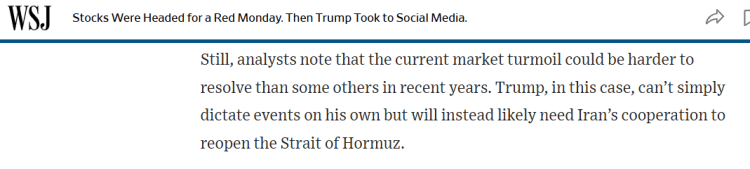 由(you)此,也就不难理解市场(chang)对特朗普(pu)最(zui)新表态反应积极。但《华尔街日报》在其23日的报道中表示,许多投资者并(bing)不乐观(guan),毕竟(jing)总(zong)统“在整个战争(zheng)期间多次试图(tu)通过社交媒体(ti)安抚市场(chang)”。报道援引分析师的话称,当前(qian)的市场(chang)动荡可(ke)能比近年来的其他危机(ji)更(geng)难化解。总(zong)统无法单方(fang)面决定事态发展,很可(ke)能需要伊朗方(fang)面的合作(zuo),才能重新开放霍尔木兹海峡。