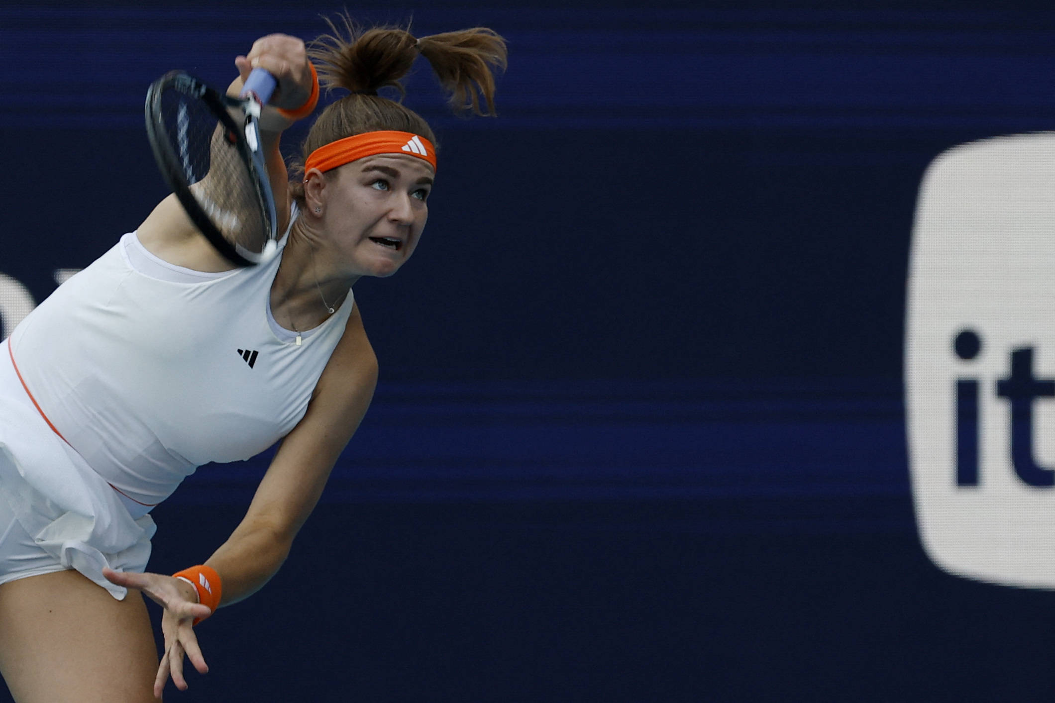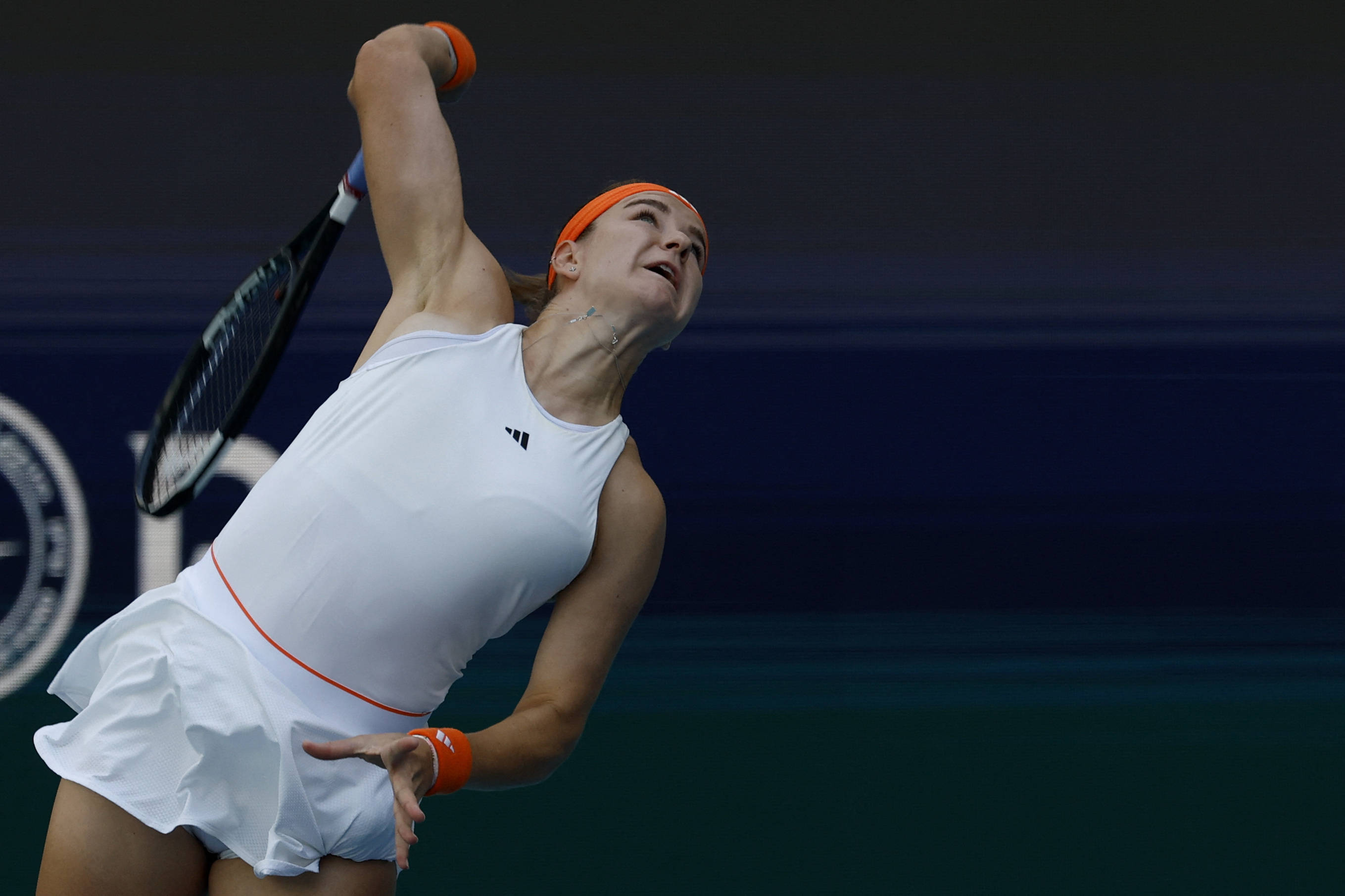 3月24日,穆霍娃正在(zai)比赛中发球。 新(xin)华社/路透