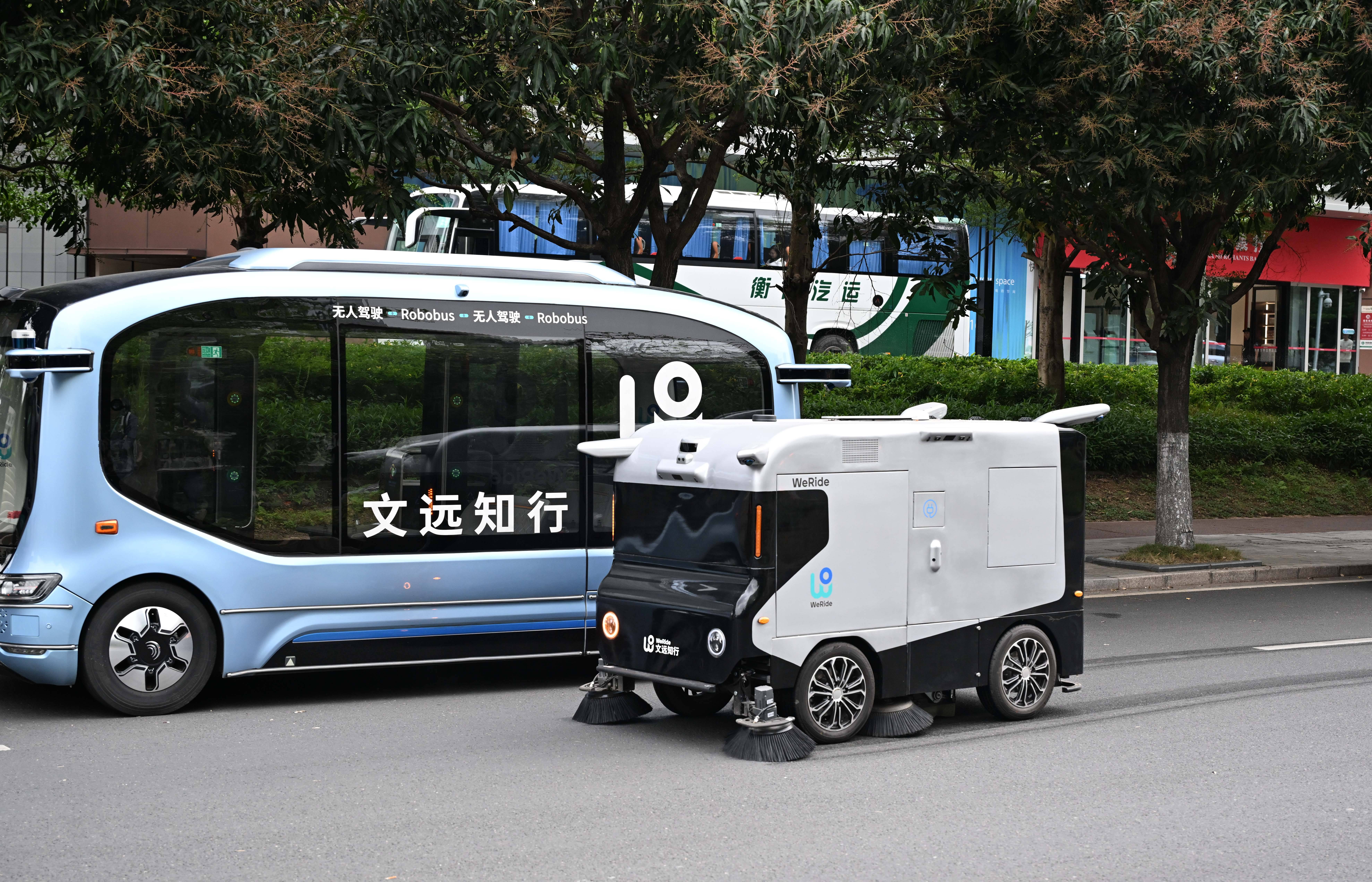 3月24日,在广州市海珠区螺旋大道拍摄的文远知行自动驾(jia)驶扫路机和自动驾(jia)驶小巴。 新华社(she)记者 邓华 摄