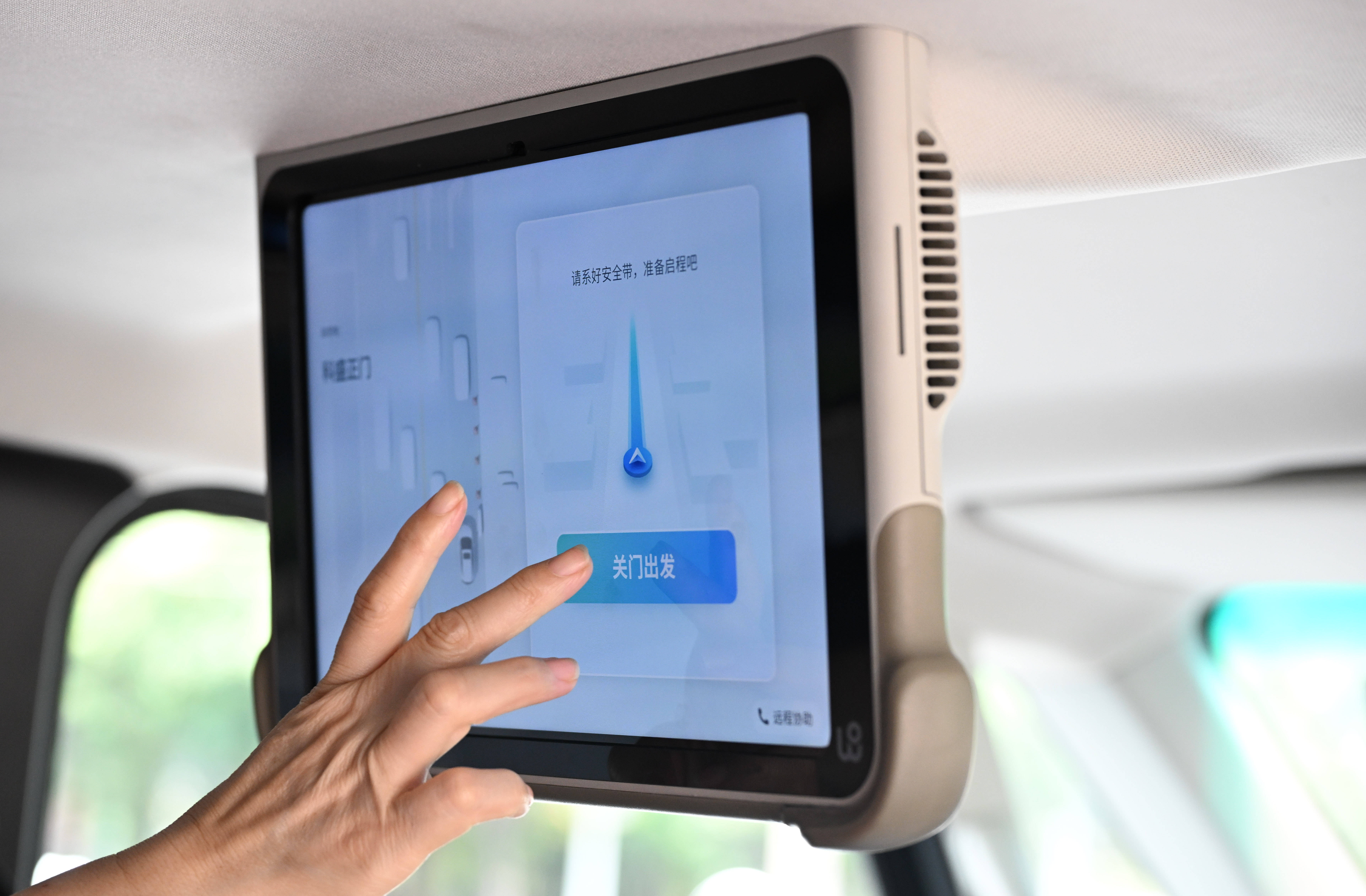 3月24日,在广州市海珠区螺旋大道,乘客在文远知行自动驾(jia)驶小巴点击屏幕启动汽车。 新华社(she)记者 邓华 摄