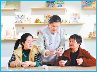 高效能治理 容城县衍纸制作技(ji)艺非遗(yi)代表性传承人邢娟(juan)(中)在雄(xiong)安(an)新区容西(xi)第一养(yang)老驿站教当地群众制作衍纸手工艺品。 本报记者 蒋雨(yu)师摄