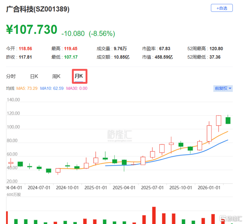 广合科技已(yi)于(yu)2024年4月正在A股上市,证(zheng)券代码:001389.SZ,停止2026年3月3日收盘(pan),公司A股股价107.73元/股,市值为458.6亿元。