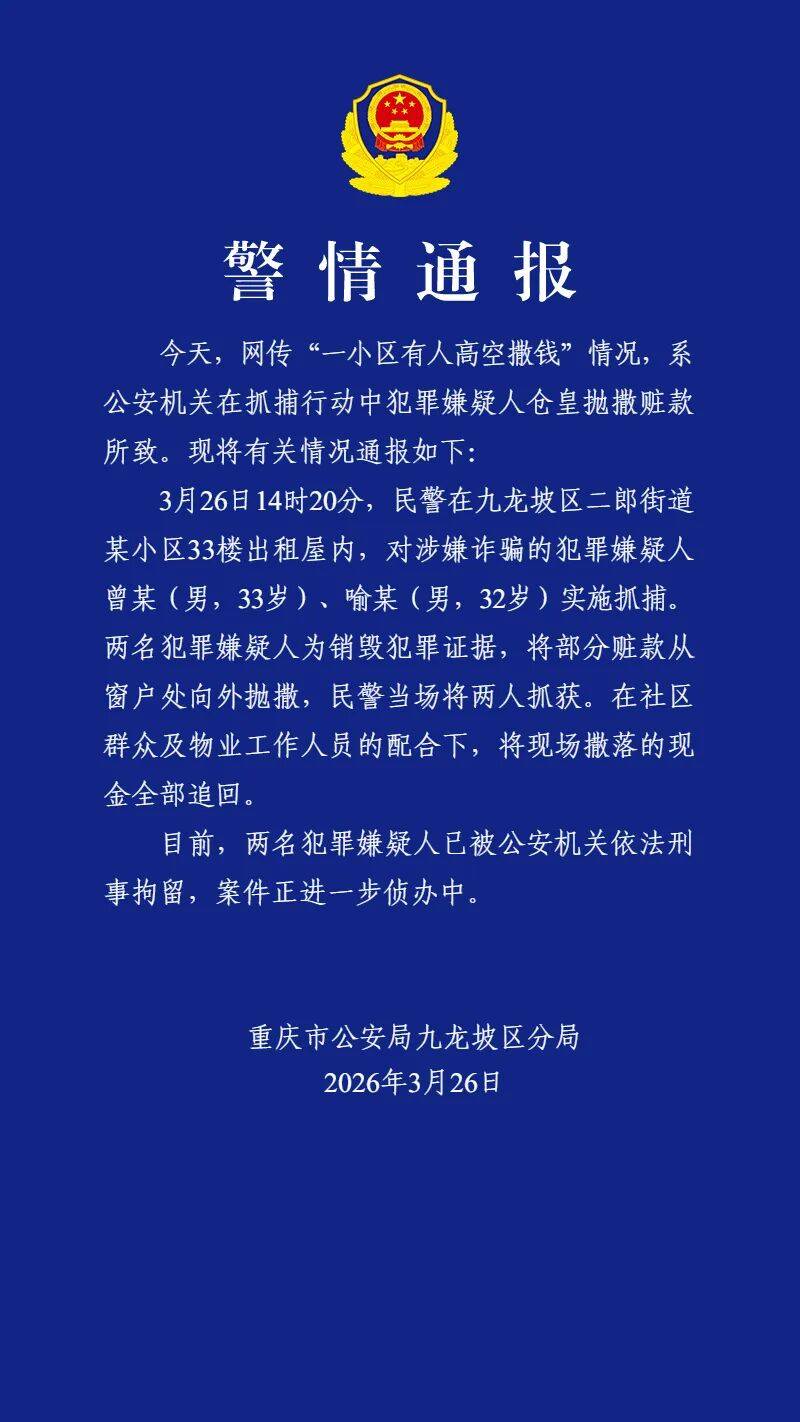 3月26日晚,重庆市公安局九龙(long)坡区分局就“有人高(gao)空(kong)撒钱”一事发布通(tong)报(bao)。