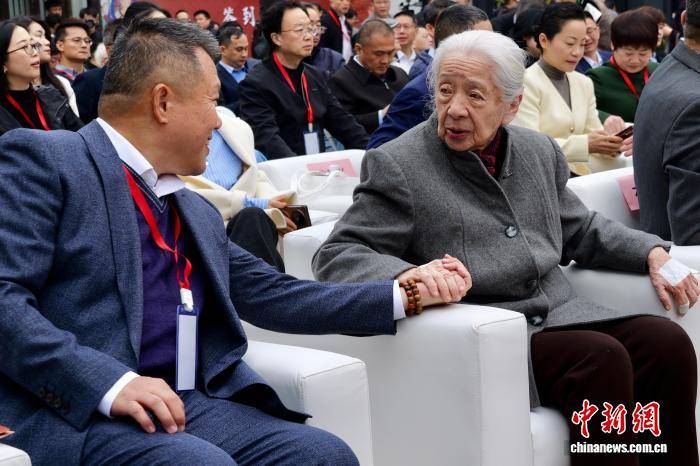 3月26日,常沙娜(右)和预(yu)会高朋交谈。中新社记者 钱(qian)晨菲 摄