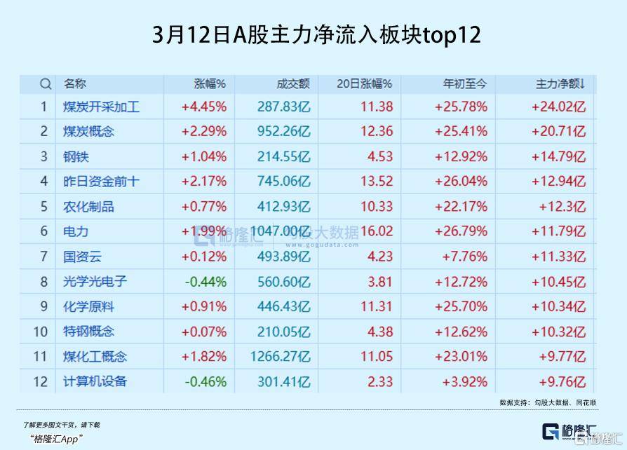 截(jie)至收盘,煤炭开(kai)采(cai)板块大涨4.45%,煤化(hua)工板块涨近2%,郑州煤电(dian)、兖矿(kuang)能源、陕西黑猫、华电(dian)能源、潞化(hua)科技、金牛化(hua)工等十多(duo)只标(biao)的涨停,大量龙头单日净流入均超亿元。