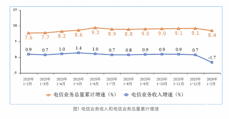 展(zhan)望2026年整年,通讯业机遇与挑战并存。一方(fang)面,传(chuan)统通讯业务下滑态势难以逆转,市场竞争将越发(fa)激烈;另一方(fang)面,数字经济的(de)疾速进展(zhan),将为通讯业带来广阔的(de)进展(zhan)空间。前2个(ge)月,电(dian)信(xin)业务支出累计完成2904亿元,同比下落1.7%,但按(an)上年稳定价计算(suan)的(de)电(dian)信(xin)业务总量同比增(zeng)长(chang)8.4%。