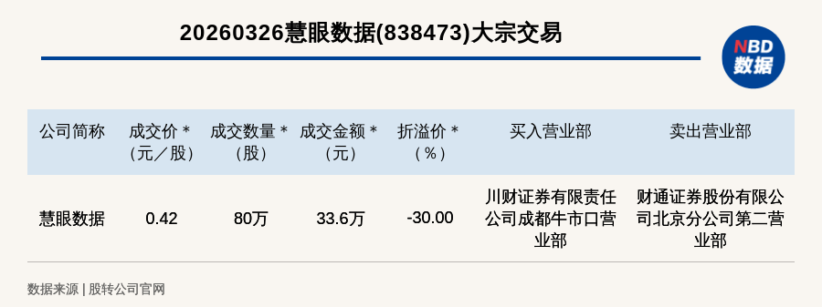 每(mei)经讯,2026年(nian)3月26日,新三板基础层公司(si)慧眼数据(838473,收盘价:0.6元)发(fa)生一(yi)笔大宗交易(yi),成交价0.42元/股,成交数量80万股,成交金额33.6万元,折价30%。买入营业部是川财证券无限责任公司(si)成都牛市口营业部,卖出营业部是财通(tong)证券股分(fen)无限公司(si)北京(jing)分(fen)公司(si)第二营业部。