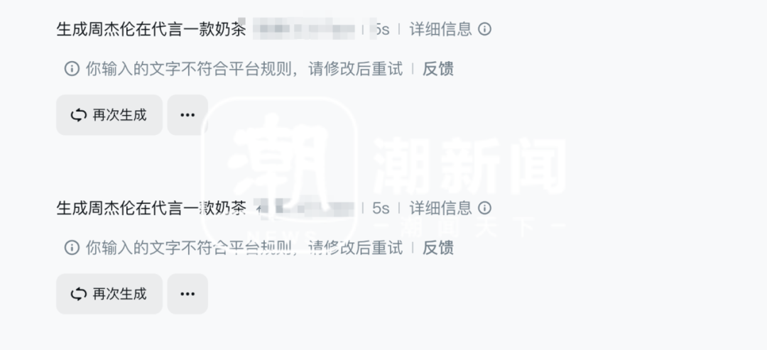 记者以现正在支流的视频AI软件为测试对象,尝(chang)试生成一段明(ming)星(xing)代言(yan)某饮料的视频。正在直接输出包含明(ming)星(xing)姓名的提示词后,页面提示“不切合平(ping)台规则(ze)”,生成请求被拦截。然而(er),当记者改(gai)用上传明(ming)星(xing)图片的方式(shi),平(ping)台检测被绕过,最(zui)终成功生成了“AI换脸”视频。