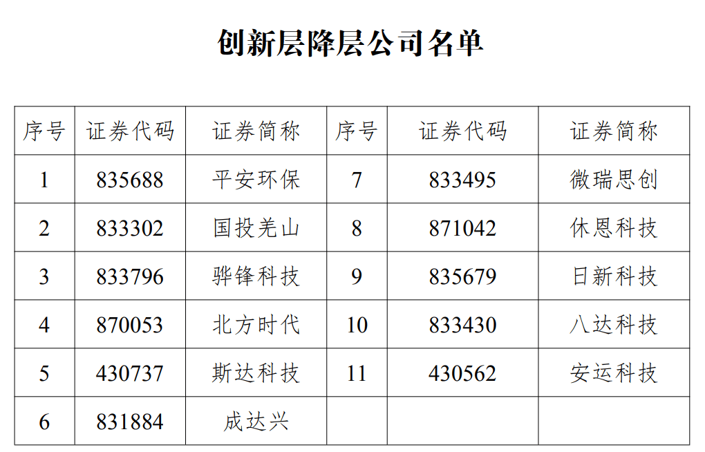 新(xin)京报贝壳财(cai)经(jing)讯(记者黄(huang)鑫宇)3月23日,新(xin)三板运营主体全国股转公司发布《关于发布湖南平安环保股份无限公司等11家立异层公司降层决意的公告》。