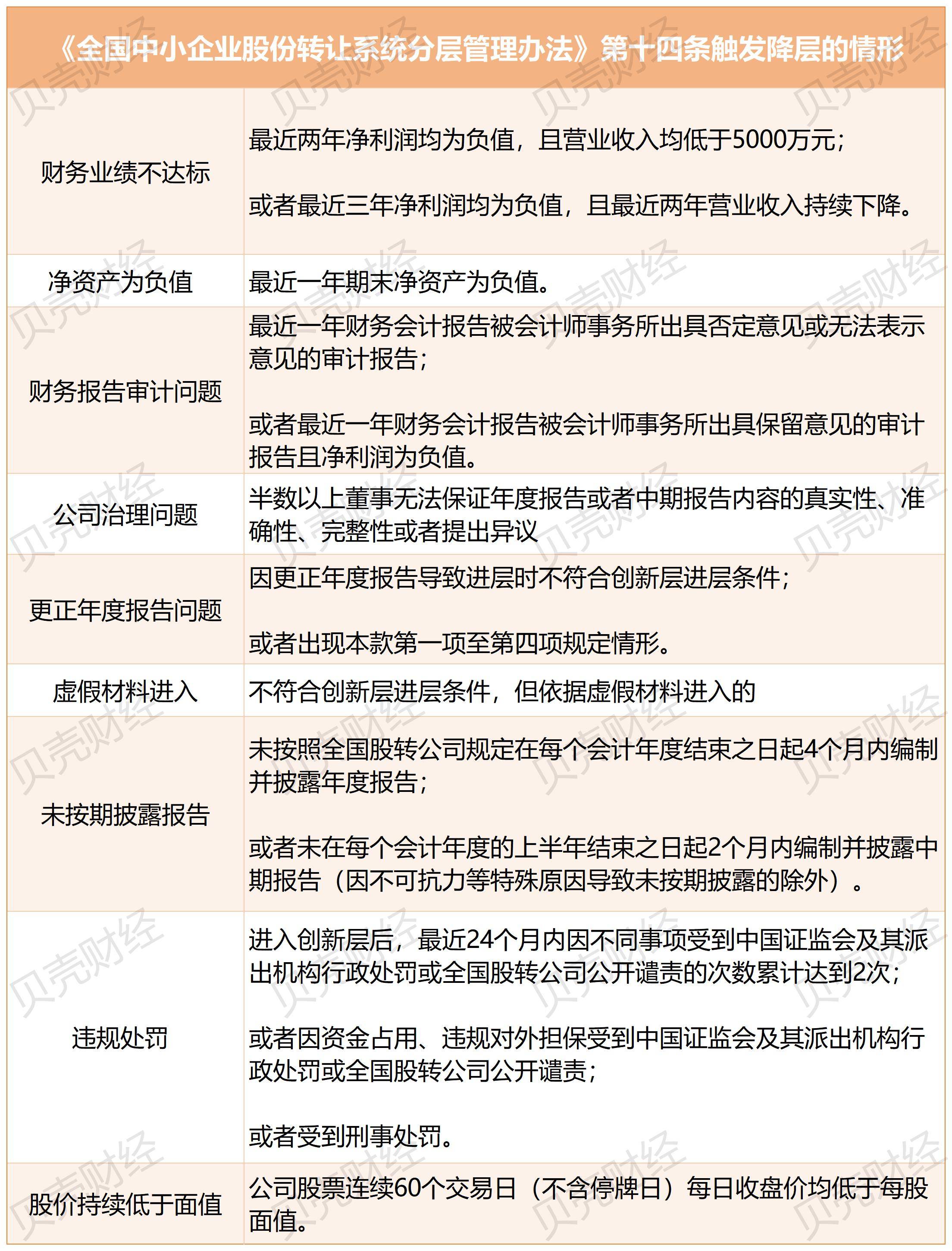 《分层举措》第十四条中(zhong)还规定了其他触发立异层公司降层的景遇,包括“财(cai)务业绩没有(you)达标”“净资产为负值”等。
