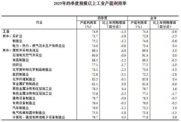 分(fen)主要行业看,2025年(nian)四季度,煤炭开采(cai)和洗选业产能利用率为69.1%,食品制造业为68.5%,纺(fang)织业为77.1%,化学原(yuan)料和化学制品制造业为74.1%,非金属矿(kuang)物制品业为61.1%,黑色金属冶炼和压延加工业为78.5%,有(you)色金属冶炼和压延加工业为75.8%,通用设(she)备制造业为78.7%,专用设(she)备制造业为76.4%,汽车制造业为76.0%,电气机械和器材制造业为75.0%,计算机、通信和其他电子设(she)备制造业为79.7%。