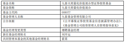 我国经济网北京(jing)3月26日讯 今日,九泰基金通(tong)告,九泰天奕量化价值混合(he)增(zeng)聘刘(liu)开运。
