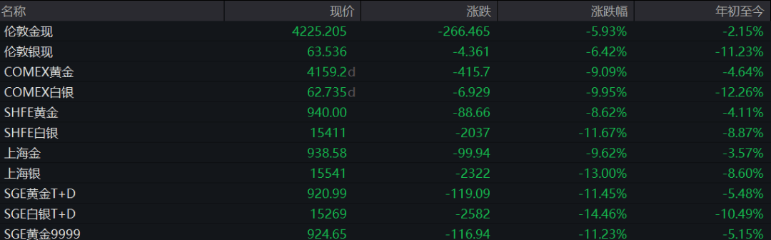 Wind数据显示,截(jie)至发稿,现货黄金下跌(die)5.93%至4225.21美元/盎司,盘(pan)中(zhong)一度跌(die)逾8%至4098.25美元/盎司;现货白银(伦敦银现)下跌(die)6.42%,报63.54美元/盎司,盘(pan)中(zhong)一度跌(die)逾10%。