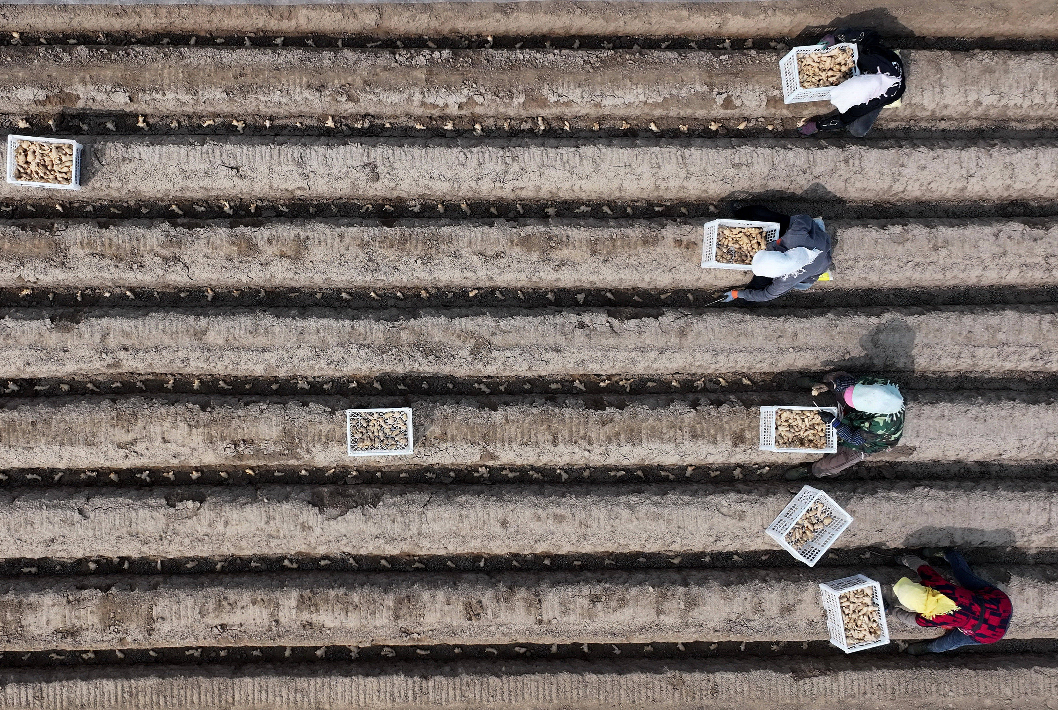 3月26日,河北省唐山市(shi)丰南区大新庄镇的农(nong)民在田(tian)间(jian)收获(huo)生姜(无人机照片(pian))。 新华(hua)社(she)记者 杨世(shi)尧 摄