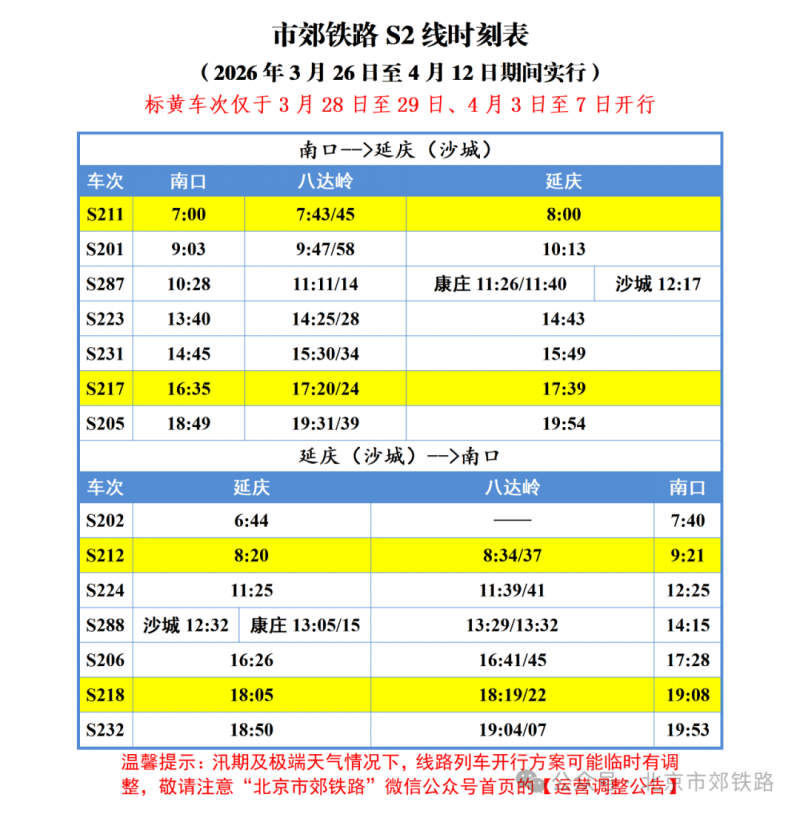 为(wei)满足乘客春季踏青出行(xing)需求,2026年3月26日至4月12日期间(jian),S2线列车运行(xing)图调整,清(qing)明假期前一个周末(mo)(3月28日、29日)、清(qing)明假期及前后一天(4月3日—7日)开行(xing)7对列车,其余日期开行(xing)5对列车。