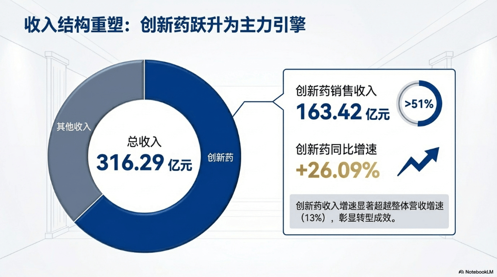 财报(bao)中最显著(zhu)的亮点正在于创新(xin)战(zhan)略的成效加(jia)速兑现(xian)。2025年,公司创新(xin)药销售支出达163.42亿元,同比增长26.09%,占药品销售支出的比重提升至58.34%,已(yi)成为(wei)公司增长的焦点动力。与此同时,创新(xin)药对外授权业务孝敬支出33.92亿元,组成继自主销售之后,驱动业绩增长的又一重要引擎。